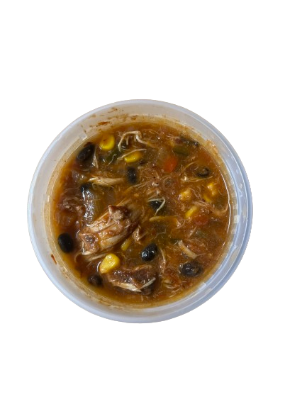 Shredded Chicken. Corn. Crushed Tomato. Green Chiles. Black Beans. Onion. Cilantro.