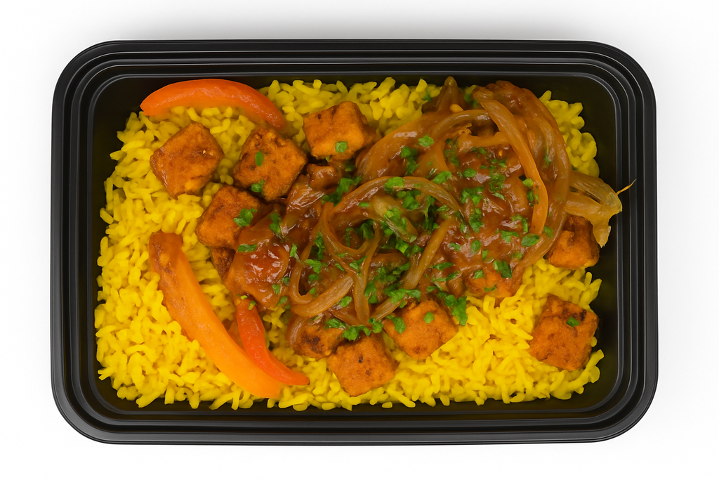 Lightly fried tofu tossed in our signature Cajun seasoning, then baked to golden perfection. Drizzled with a warm hot-honey glaze and served over fragrant yellow rice with char-grilled peppers and onions. Finished with fresh chives and an extra touch of hot honey for the perfect sweet-heat balance.