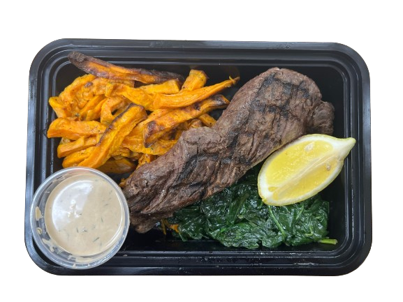 Pan-Seared Hanger Steak. Sauteed Spinach. Hand-Cut Sweet Potato Fries. Side of Special Mayo (Onion, Dill, Roasted Garlic, Dijon Mustard, Worcestershire)