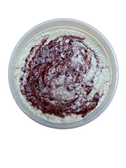 Banana Infused Almond Milk. Peanut Butter. House strawberry & Cranberry Chia Seed Jam. Rolled Oats