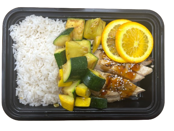 Grilled Chicken Breast. Squash. Zucchini. Jasmine Rice. Teriyaki Glaze. White Sesame Seeds