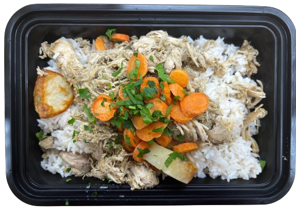 Curry Braised Chicken Thighs. Carrot. Potato. Onion. Served over Jasmine Rice